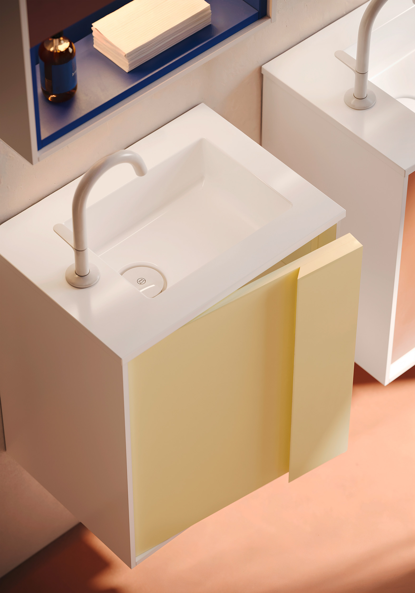 Das Gästebad-Sortiment besteht aus einem 46 cm breiten Mineralguss-Waschtisch mit Waschtischunterschrank und einem 42 cm breiten Spiegelschrank mit offenem Fach, moderner E-Box und horizontaler LED-Beleuchtung. Der besondere Moto-Griff dreht sich mit der Tür um 90 Grad. Halbe Größe, doppelte Wirkung: In kleinen Räumen wirken das beleuchtete offene Spiegelschrank-Fach und das jeweilige Farbkonzept besonders prägend. Und so ist die Gästebad-Lösung von Moto mehr als ein Kleinformat des großen Bruders – sie ist eine Einladung zu faszinierenden Farbspielen. Alleine oder in Zweierreihe, in sphärischem Weiß-in-Weiß, in pastelliger Harmonie mit hellen und holzigen Tönen oder in extrovertiertem Farbkontrast: Mit den kompakten Ensembles aus Waschtischkombi und Spiegelschrank wird aus jedem kleinen Bad ganz schnell ein starkes Statement.