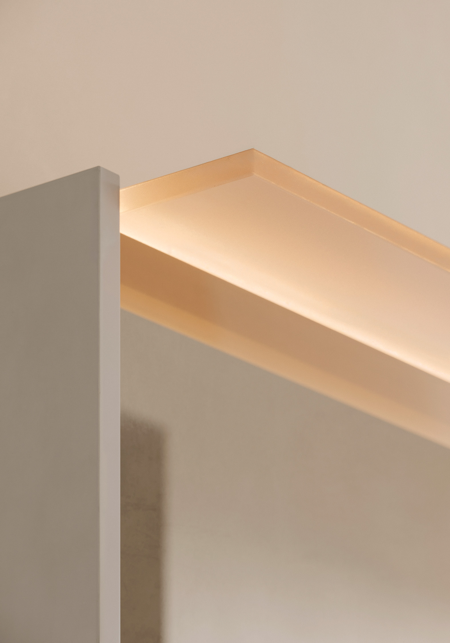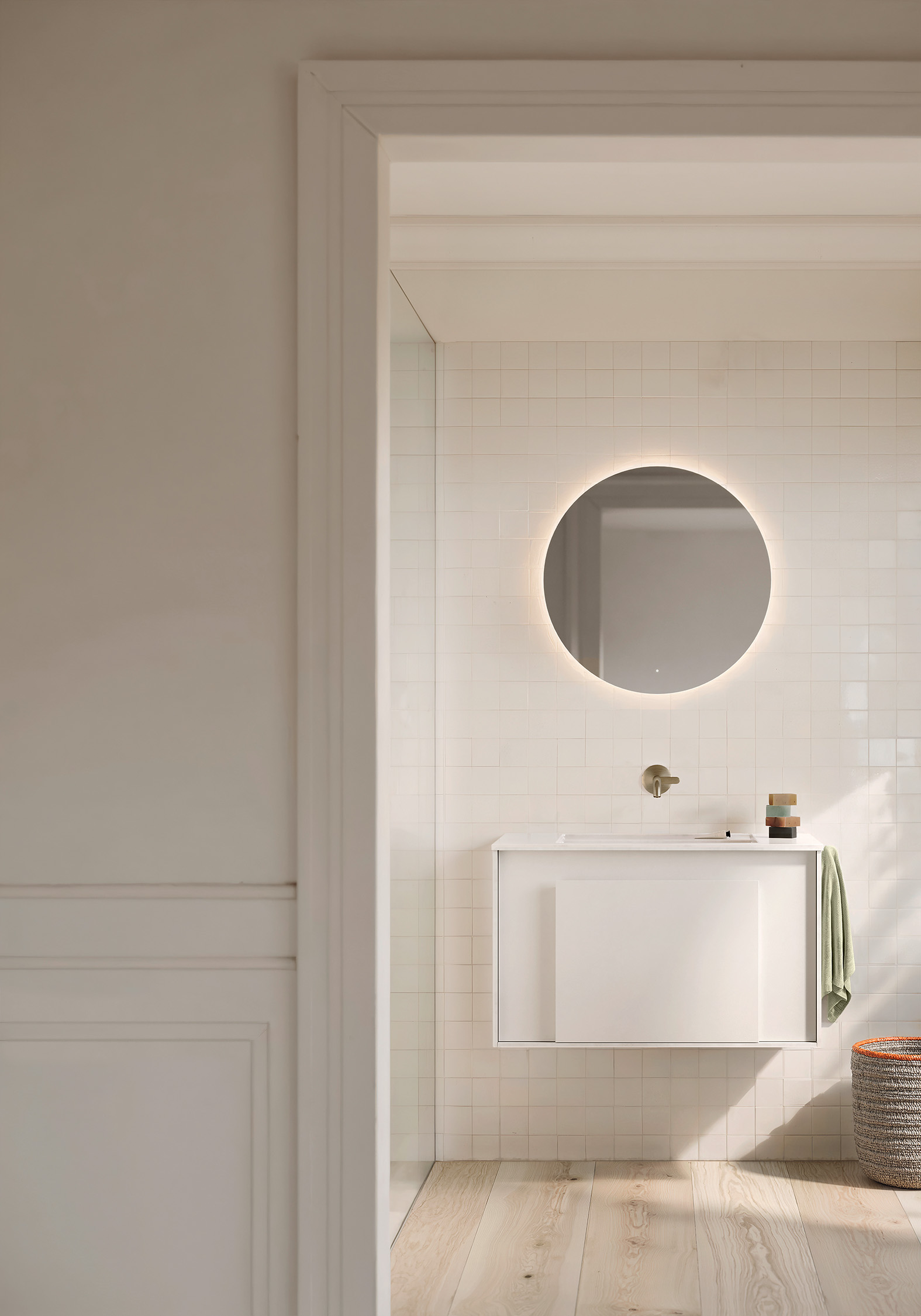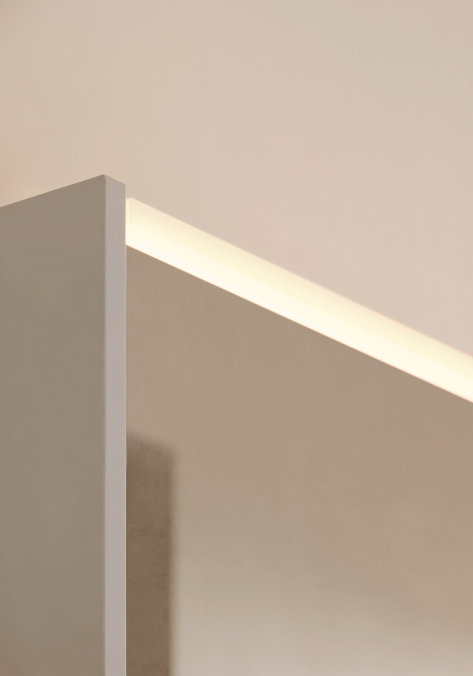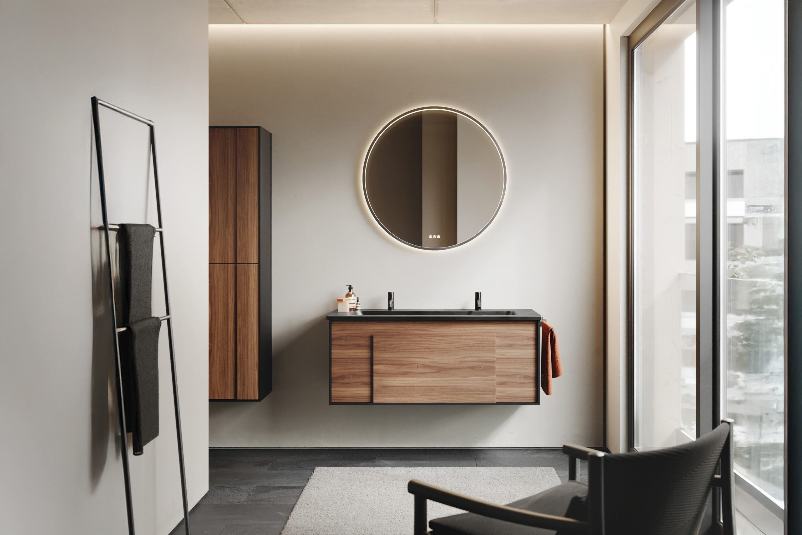 Alle Modelle verfügen über eine Waschtischbeleuchtung. Die über den Spiegeltüren eingesetzte horizontale LED-Beleuchtung kann als vorkragendes Lichtsegel oder als dezentes, bündig integriertes Lichtband gewählt werden. Zu der hochwertigen Innenausführung gehört unter anderem auch die neue E-Box mit Drehschalter zum Dimmen und zur Lichttemperatursteuerung, eine Steckdose und zwei USB-C-Ports.